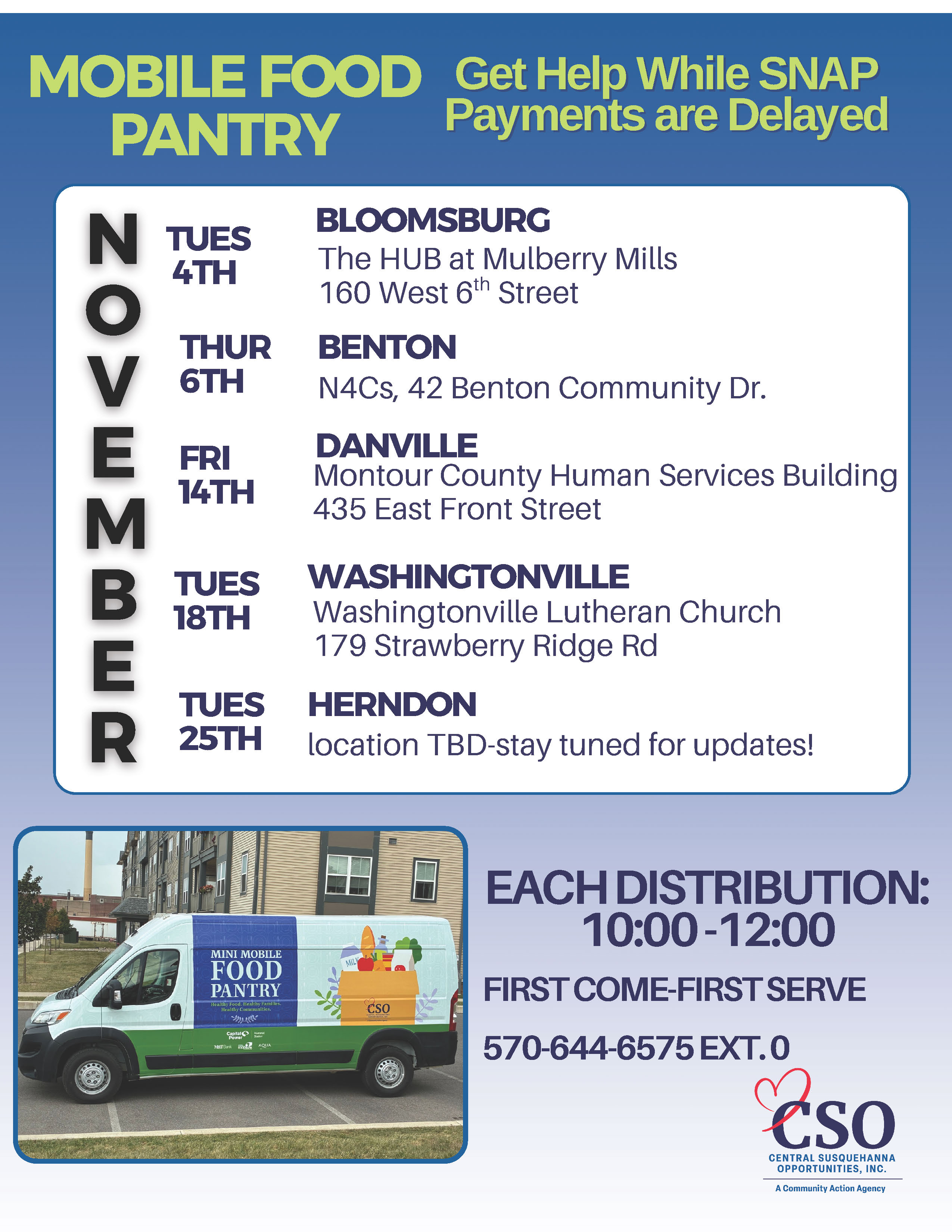 Legislation requiring school districts to notify parents and school employees of any incidents involving possession of weapons on school property is set to become law. Under current law, school districts are not required to inform parents or guardians about incidents when a weapon is brought onto school grounds or to related activities. The changes in Senate Bill 246 apply to public, nonpublic and private schools. The bill, which first passed the Senate in May, received strong bipartisan support from the General Assembly and now awaits the governor’s signature. Updates on SNAP, LIHEAP, and Local Assistance ResourcesDue to the ongoing federal budget shutdown, Supplemental Nutrition Assistance Program (SNAP) payments will not be issued in November. In addition, the Low-Income Home Energy Assistance Program (LIHEAP) has delayed its opening until December 3, 2025, or later. My office is staying in close contact with community partners who are responding to these challenges. Megan Bair, Executive Director of Central Susquehanna Opportunities (CSO), has been leading local coordination efforts to secure emergency food and heating resources. CSO has arranged six additional mobile food distributions in November to help families meet immediate needs: November Mobile Food Distribution Schedule