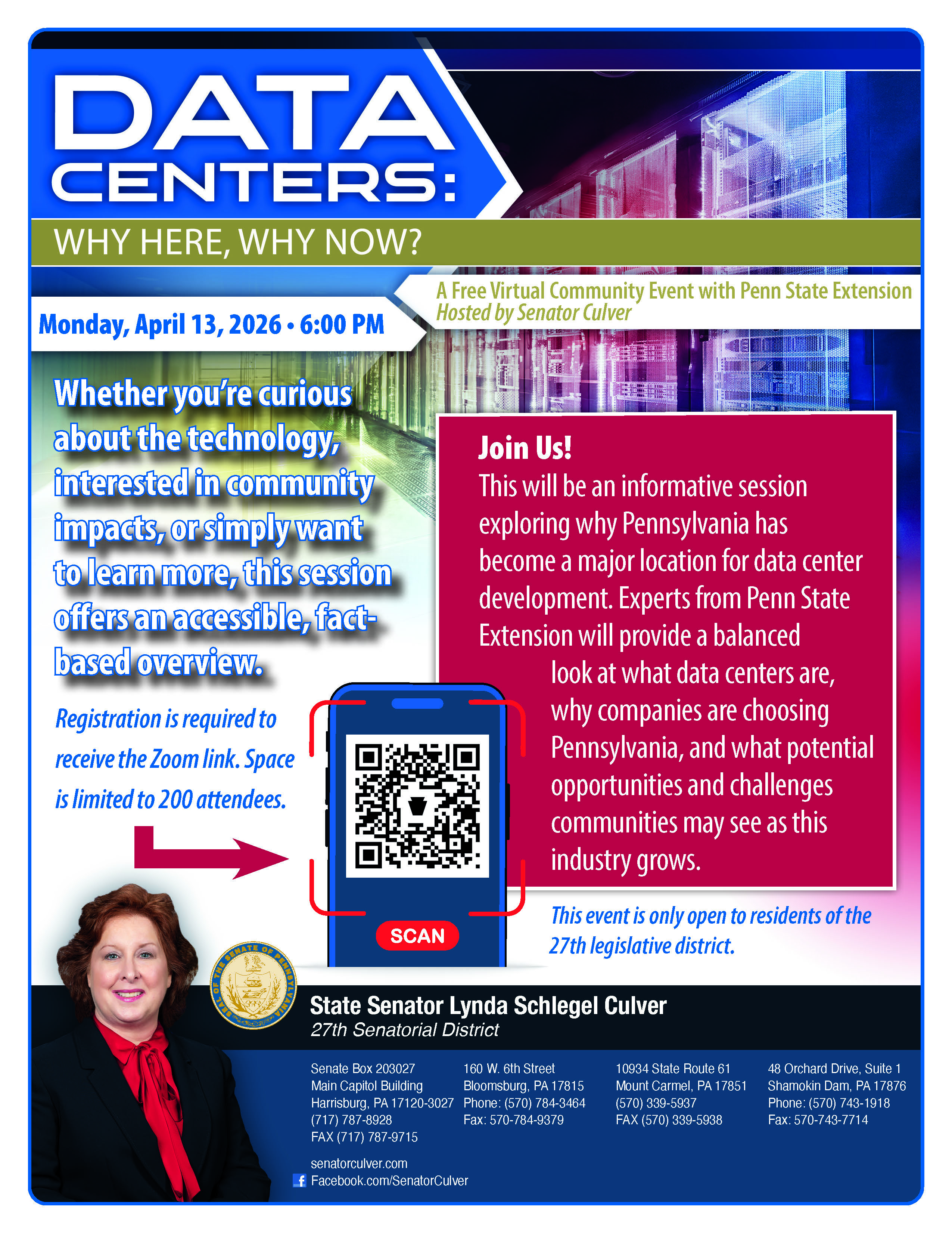 Join Me for a Virtual Event on Data CentersOn Monday, April 13 at 6:00 p.m., I will be hosting a free virtual community event with Penn State Extension called “Data Centers: Why Here, Why Now?” This event is open to residents of the 27th Senatorial District and will offer a fact-based overview of a topic that is receiving growing attention across Pennsylvania. During the session, experts from Penn State Extension will explain what data centers are, why companies are choosing Pennsylvania for development, and what potential opportunities and challenges communities may see as this industry grows. Whether you are curious about the technology, interested in local impacts, or simply want to learn more. Registration is required to receive the Zoom link, and space is limited to 200 attendees. Residents can sign up here: https://senatorculver.com/psrc-events/data-centers-041326/